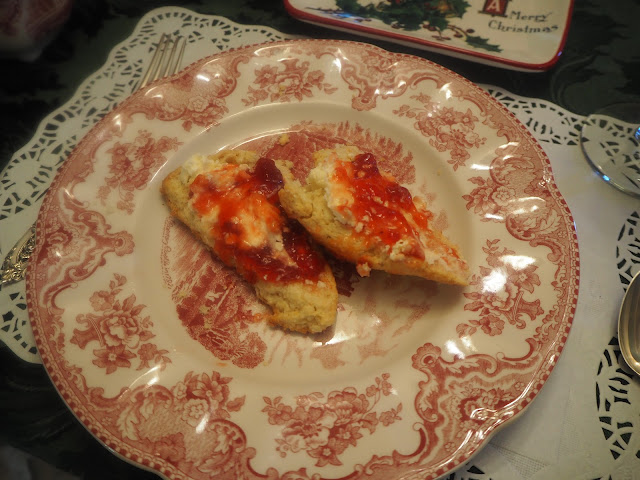 The Take Joy Society got together yesterday for a Christmas Tea at Carol's house. Here is her lovely table set for our festivities.....